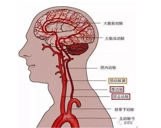 椎动脉沿着脊椎进入脑部,一般很难感觉到。但颈主动脉就高调的多,离皮肤表面也特别近,你轻按自己脖子两侧靠上位置噗通噗通在跳的就是颈主动脉。我们的颈部动脉分布复杂,其中,脑部血流的两个“供应商”大户就是颈总动脉(common carotid artery)和椎动脉(vertebral artery)。
