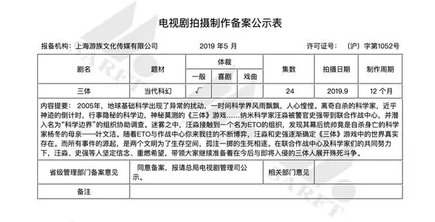 至于游族的《三体》电视剧备案,在2016年就出现过并同样通过了审批,本次能否成功拍摄、能拍出什么样来,显然也都是未知数。
