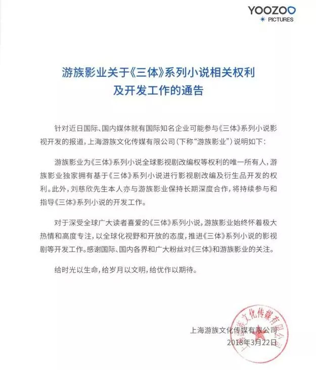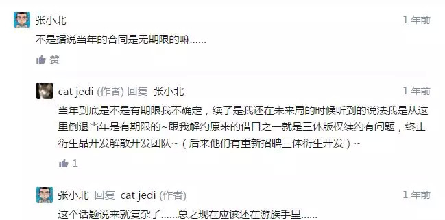 而知名度更高的盗墓IP们,还在为版权的混乱买单,久久没有高口碑作品出现;《三体》系列改编权,还捏在游族手中,成功影视化遥遥无期。并且据知乎上影评人张小北在相关回答评论区的讨论,《三体》的影视改编权是无限期/已经续期了的,这就更令粉丝心忧了。