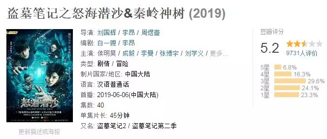 两大盗墓网文IP的开发都是一盘散沙、各自为战。《盗墓笔记》虽然剧集改编权主要在欢瑞手中,实际效果也差不多,剧集项目与项目之间毫无实际统筹,各自割裂,近期播出中的《盗墓笔记之怒海潜沙&秦岭神树》豆瓣评分5.2,被部分网友称为“版权到期前的赶工作品”。