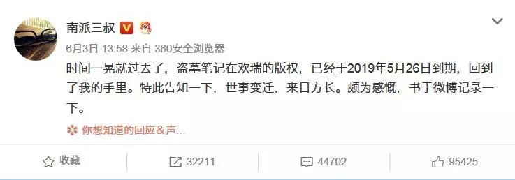 如今《鬼吹灯》系列的IP归属之混乱,作者与平台之间的纠纷都不是三言两语可以讲明白的了。《盗墓笔记》的情况稍好一些,2014年,欢瑞世纪从南派三叔手中购得《盗墓笔记》1-9部的版权,版权费合计500万元,包含从2013年开始六年电视剧版权。在近期南派三叔特地在微博发布记录,2019年5月26日在欢瑞的盗墓笔记版权已经到期,回到了自己手中。