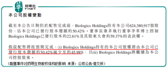据悉,截至本次配售完成前,Biologics Holdings持有药明生物50.42%股权,当中公司董事长兼非执行董事李革博士控制着Biologics Holdings已发行股本约22.61%,及其股东大会约59.37%的表决权。假设配售将按预期完成,Biologics Holdings于药明生物的持股量将由50.42%减少至约45.98%,并继续为公司控股股东。