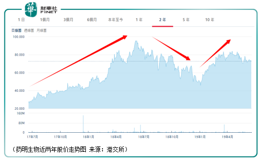 如下图可见,上市以来药明生物的股价突飞猛进,从上市价20.6元最高涨至2018年6月的95元以上高位(2018年6月8日收市价95.7元),累计涨幅最高达3.65倍。尽管2018年下半年公司股价一路回调下跌,但进入2019年药明生物又强势反弹走出一波小高潮;最近两个月药明生物股价有些反复走势震荡,但都维持在70元以上水平。