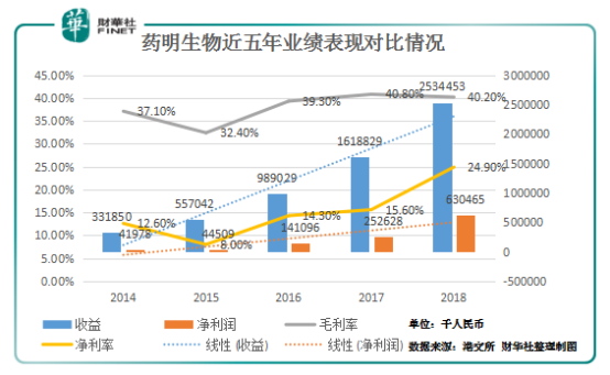 公开资料显示,2014年药明生物的营收及净利分别处于3.32亿元(人民币,下同)及4197.8万元的水平,此后的四年公司不断刷新造好业绩数据,无论营收还是净利润都实现连续高速增长。至2018年,药明生物的综合业绩再创新高,收益大幅增长56.6%至25.35亿元,净利润飙升149.6%至6.31亿元,净利率由上年的15.6%急速攀升至24.9%的水平。