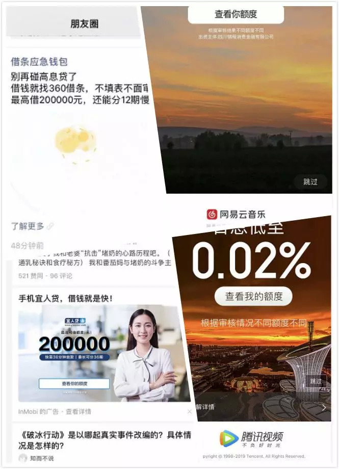 微信朋友圈、网易云音乐、知乎、腾讯视频上的现金贷广告