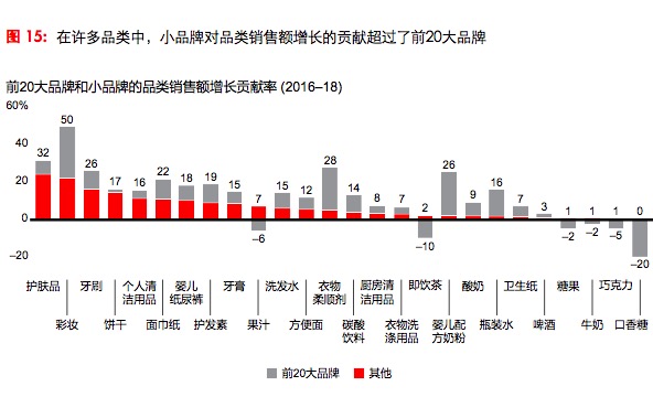 该报告给出了前20大品牌与小品牌相比的增长情况——许多品类中,小品牌对品类销售额增长的贡献超过了前20大品牌(注:前20大品牌是指营业额排名前20的品牌)。