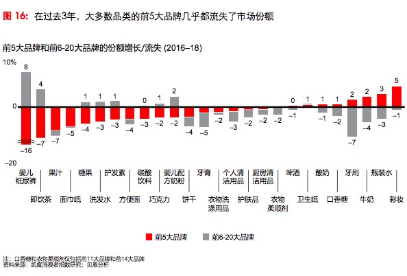 凯度消费者指数对前五大品牌与其余15个品牌的表现进行了比较。过去3年,大多数品类的前5大品牌几乎都面临市场份额流失的挑战——例如,婴儿纸尿裤流失16%、即饮茶流失7%、果汁流失6%。事实上,前五大品牌仅在四个品类提高市场份额:牙刷、牛奶、瓶装水和彩妆。