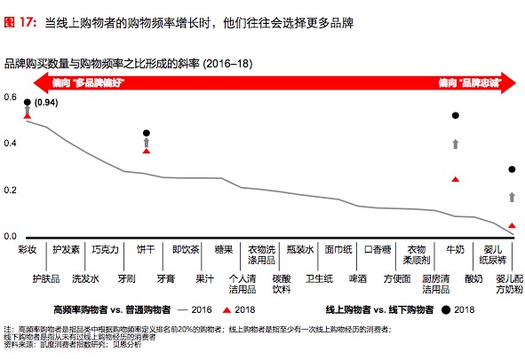 另一个使小品牌鹊起的原因是中国消费者的“多品牌偏好”行为日益明显。凯度消费者指数研究的四个品类(彩妆、饼干、牛奶和婴儿配方奶粉),是多品牌偏好-品牌忠诚区间和低频-高频线上渗透率维度的代表。这四个品类的多品牌偏好行为较两年前更明显。而且,线上消费者的多品牌偏好行为比线下消费者更为明显。随着越来越多消费者进行网购,他们的多品牌偏好行为将会增加。