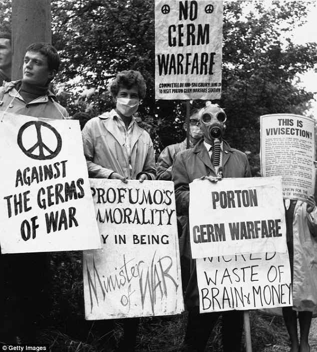 100名民众在波顿镇的军事研究所前抗议一直备受争议的细菌战争(图片来源:dailymail)