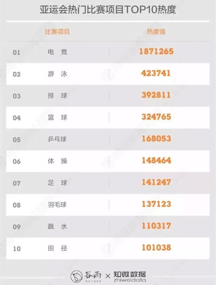 谷雨和知微数据今年发布了《亚运会人呢比赛项目TOP10热度榜》,电子竞技赫然超过游泳、排球,以高出四倍有余的热度值,强势登顶亚运会最受关注项目。