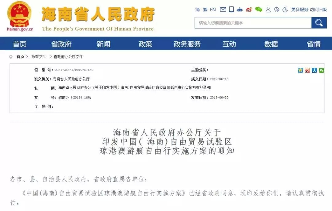 2、“中国(海南)自由贸易试验区琼港澳游艇自由行实施方案”正式印发