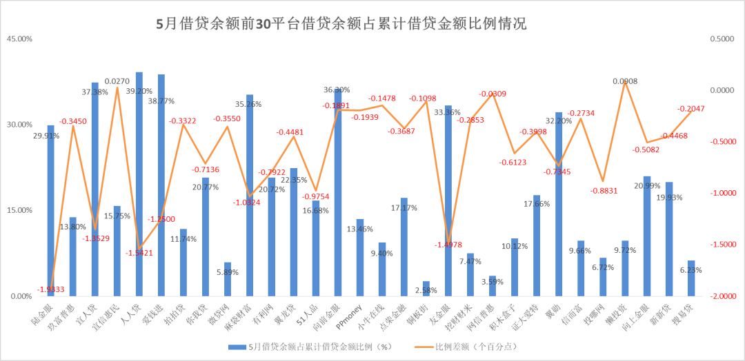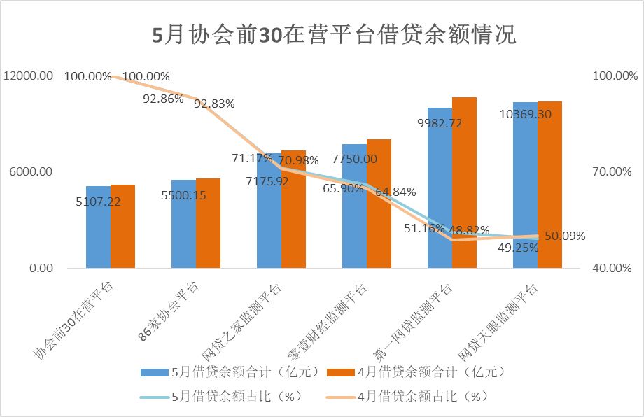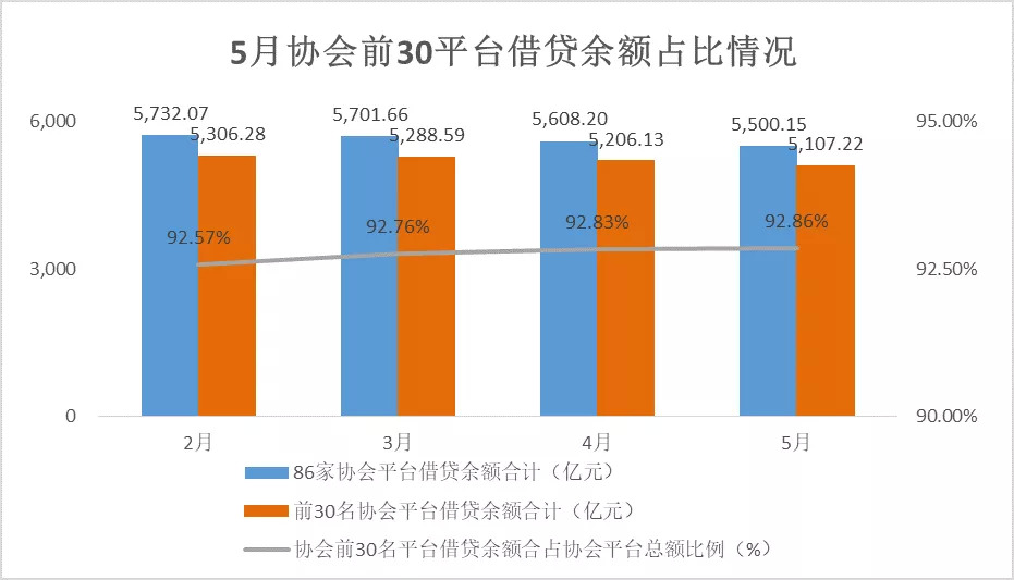 5月,协会平台整体的借贷余额加速压降,但借贷余额最高的30家平台存量业务规模占比持续提升。