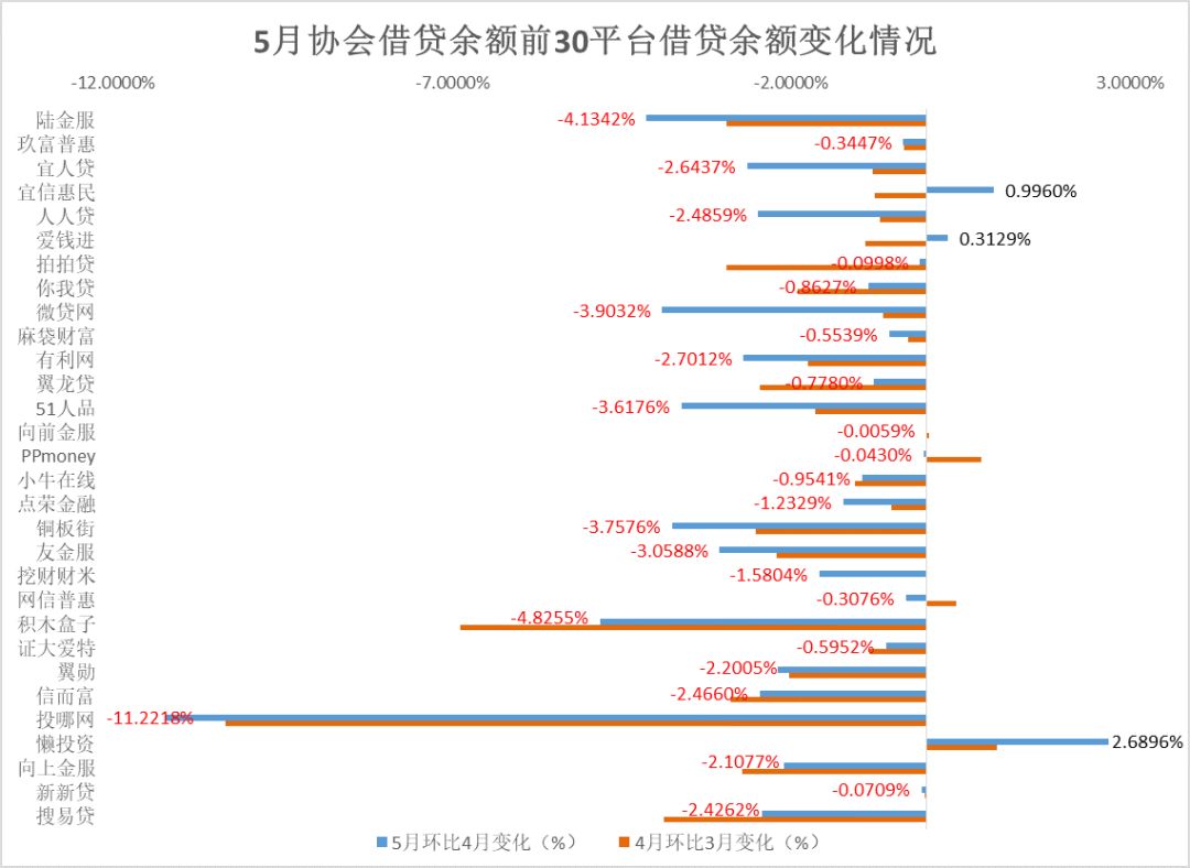 总体来看,5月,协会平台总体的借贷余额加速压降,借贷余额最高30家在营平台中的27家借贷余额下降,28家借贷余额占累计借贷金额的比例下降。仅有2家平台存量业务的绝对规模与相对规模有所增长。