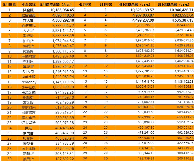 截至5月末,借贷余额较高的30家在营平台为:陆金服、玖富普惠、宜人贷、宜信惠民、人人贷、爱钱进、拍拍贷、你我贷、微贷网、麻袋财富、有利网、翼龙贷、51人品、向前金服、PPmoney、小牛在线、点荣金融、铜板街、友金服、挖财财米、网信普惠、积木盒子、证大爱特、翼勋、信而富、投哪网、懒投资、向上金服、新新贷和搜易贷。