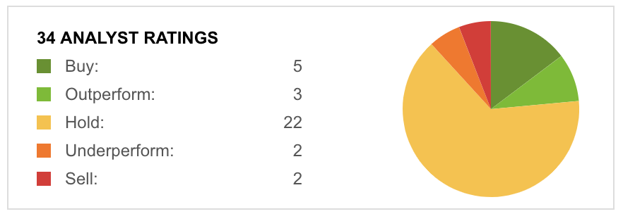 这种巧妙的做法本为了安抚资本市场的情绪,但云业务的发展不明朗还是让很多原来观望的资本开始撤离。2018 年,股神巴菲三季度买入甲骨文,到四季度就将 4140 万股甲骨文全部抛售,即使这一举动让他预计亏损高达 1200 多万美元。股市数据平台 seeking alpha 的数据显示,近三个月中,34 家专业分析机构中有 26 家给甲骨文给出了观望、不看好、卖出的意见: