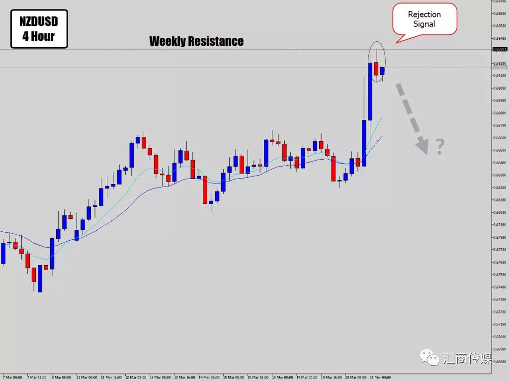 比如下图NZD/USD交易的例子,首先我在周图上寻找潜在的价格反转点: