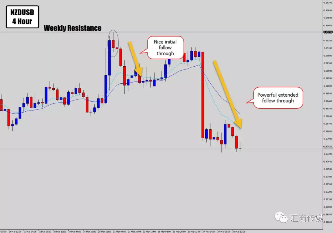 这时候自上而下的分析就显示其作用了。周图中有明显的阻力位,因此我们寻找卖出信号。4小时图上则显示出周图上信号背后的微观力量: