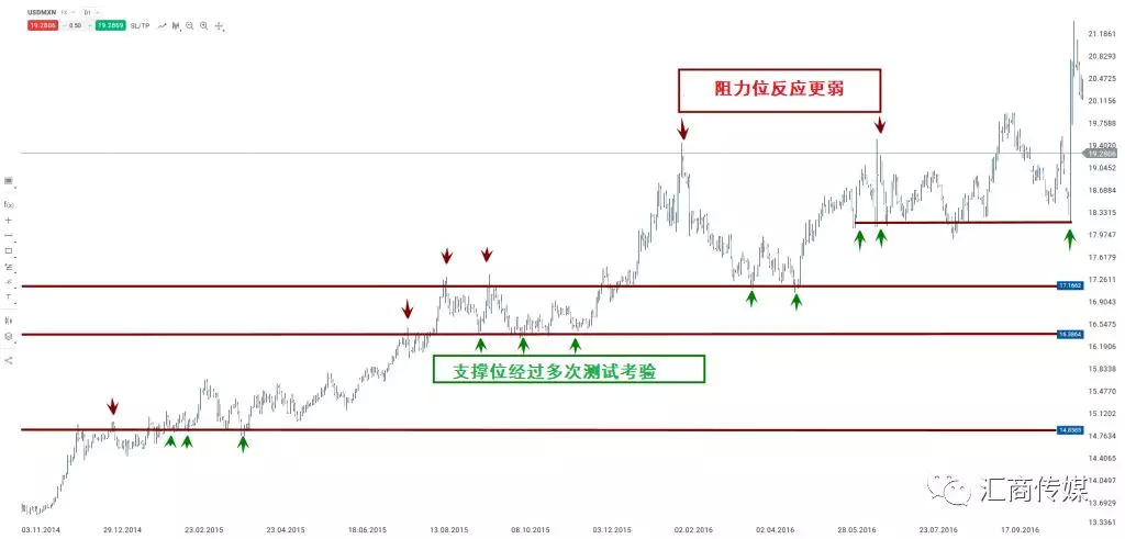 在美元/墨西哥比索(日线图)的这个图表中,注意到阻力位在突破之前只触及过很少的几次,而关键支撑位在价格走向新高之前,曾多次反复触及。这应该能告诉大家,主导的订单流去往了何处(上升),在看到这种结构和订单流发生变化之前,你希望尽可能多地跟随趋势交易。