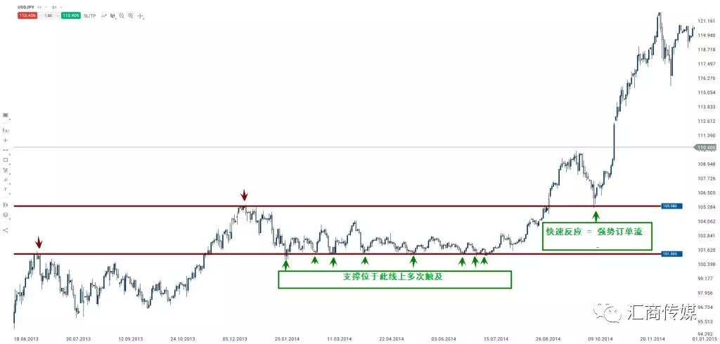 还要注意最后一个支撑位(~105.38)是如何在产生一个超级强劲的牛市移动之前几乎没有被触及的。从先前的摆动高点的快速反应,往往表示目前保持水平上有冲动和强大的订单流,这种动能会保持1-2个蜡烛图,随后再度冲高1500点。因此,在特定点位中,请务必注意这些变量蕴含的强大动能。