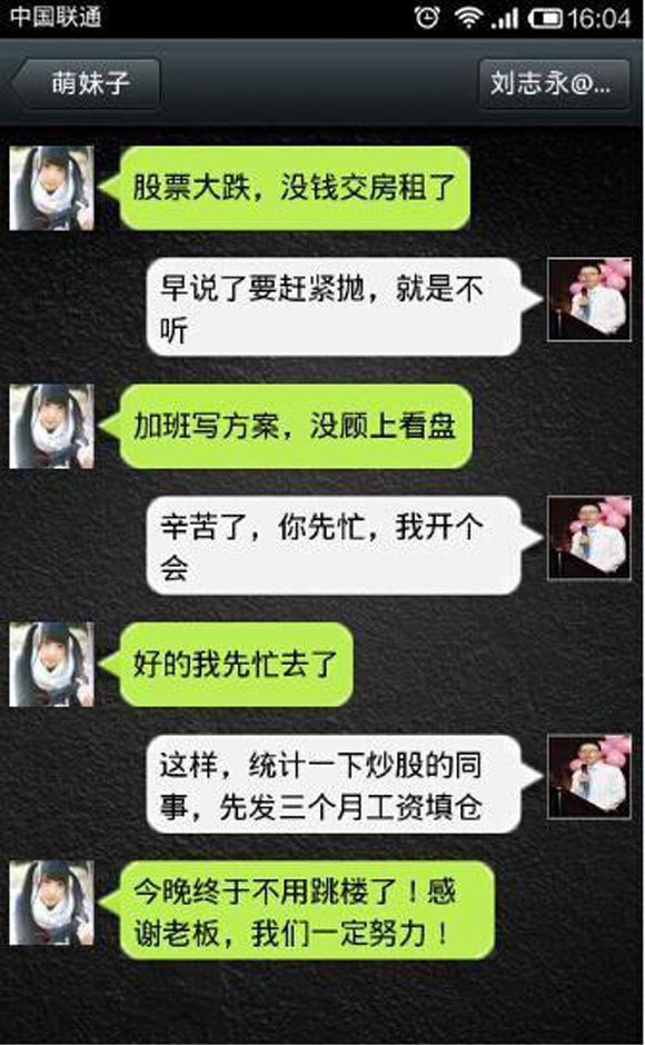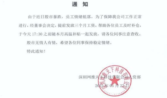 “早说了要赶紧抛,就是不听。”刚刚数落完情绪低落的员工就马上开金口表示“先发三个月工资填仓。”口头承诺还不够,正式的通知也马上发了出来。霸道总裁就这样用实际行动俘获了在暴跌中碎成渣的心。有这样的老板,还不好好安心工作就没救了。