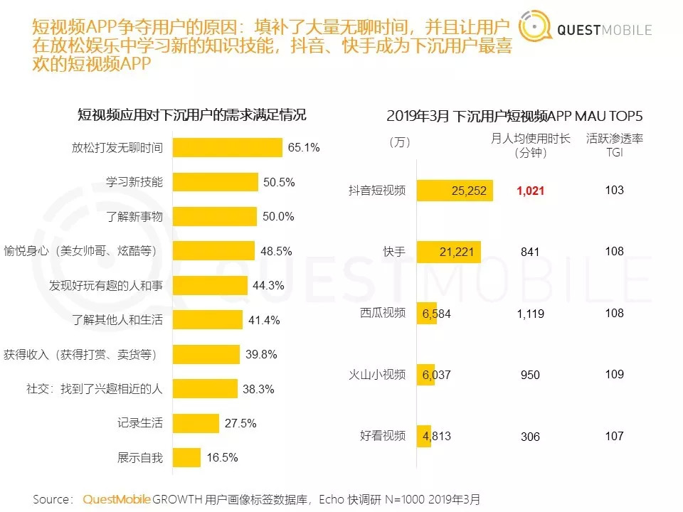 尽管短视频占据巨大流量,但流量红利主要被两家公司把持:头条系和快手,即便是BAT巨头,瓜分短视频红利依旧不易。据questmobile统计,2019年3月,抖音、快手月活分别达到2.52亿、2.12亿人次,位列全网app冠、亚军。