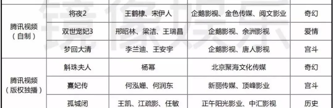 自制剧无疑是个不错的方向,但由于“新规”的下达,腾讯投注的不少剧集,包括下表统计的剧集,以及近期打算上线的仙侠剧《三生三世枕上书》、权谋剧《庆余年》,都将受到一定的影响。