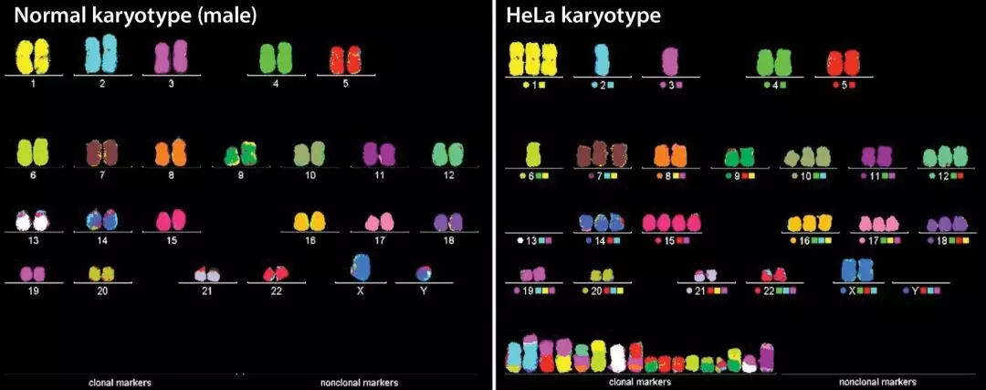 正常的人类细胞有 46 条染色体( 23对 ),而海拉细胞的染色体 76-80 个( 38-40 对 ),而且从图中可以看出它的突变率非常高,几乎每一组染色体都有突变。