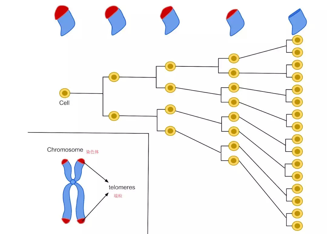 每一次的细胞分裂,染色体末端的 “ 端粒 ” 就会变小一点,在多次复制后,端粒最终会缩小到一个极限导致细胞无法再进行分裂,这个时候的细胞就达到了自己的 “ 海夫利克极限 ” ,最终凋亡。就好比我们拿毛笔写字,这支毛笔只蘸了一次墨水,写几个字之后就没墨了。