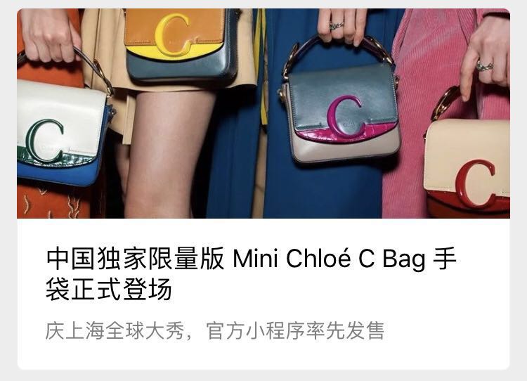 社交媒体上产生的影响力还能与线上铺设好的零售渠道环环相扣,把话题热度向零售端转化。例如6月初刚在上海办秀的Chloe,办秀当天请到数位明星看秀,次日便在微信小程序上推出了限定的中国独家包袋。