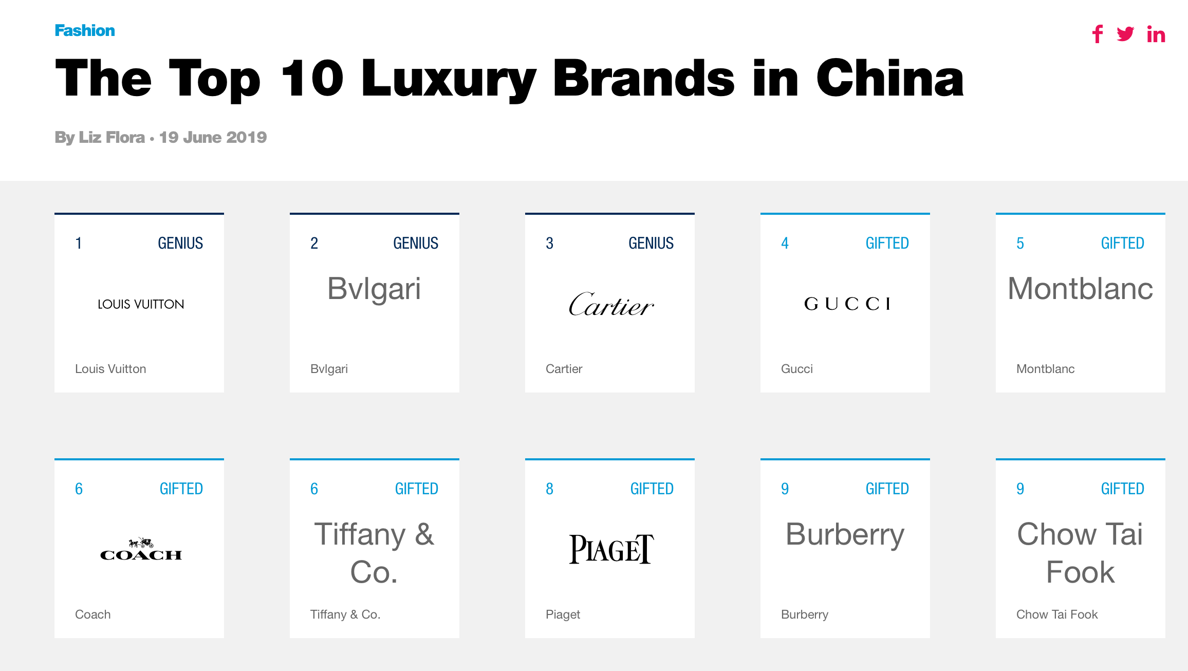 6月19日,纽约数字研究机构L2公布了一份名为《Digital IQ Inditex: Luxury China 2019(数字化智商指数:2019中国奢侈品市场)》榜单,列出了2019年在中国市场数字化表现最好的十个奢侈品牌。Louis Vuitton、宝格丽、卡地亚、GUCCI、万宝龙、Coach、Tiffany、伯爵、Burberry和周大福上榜。
