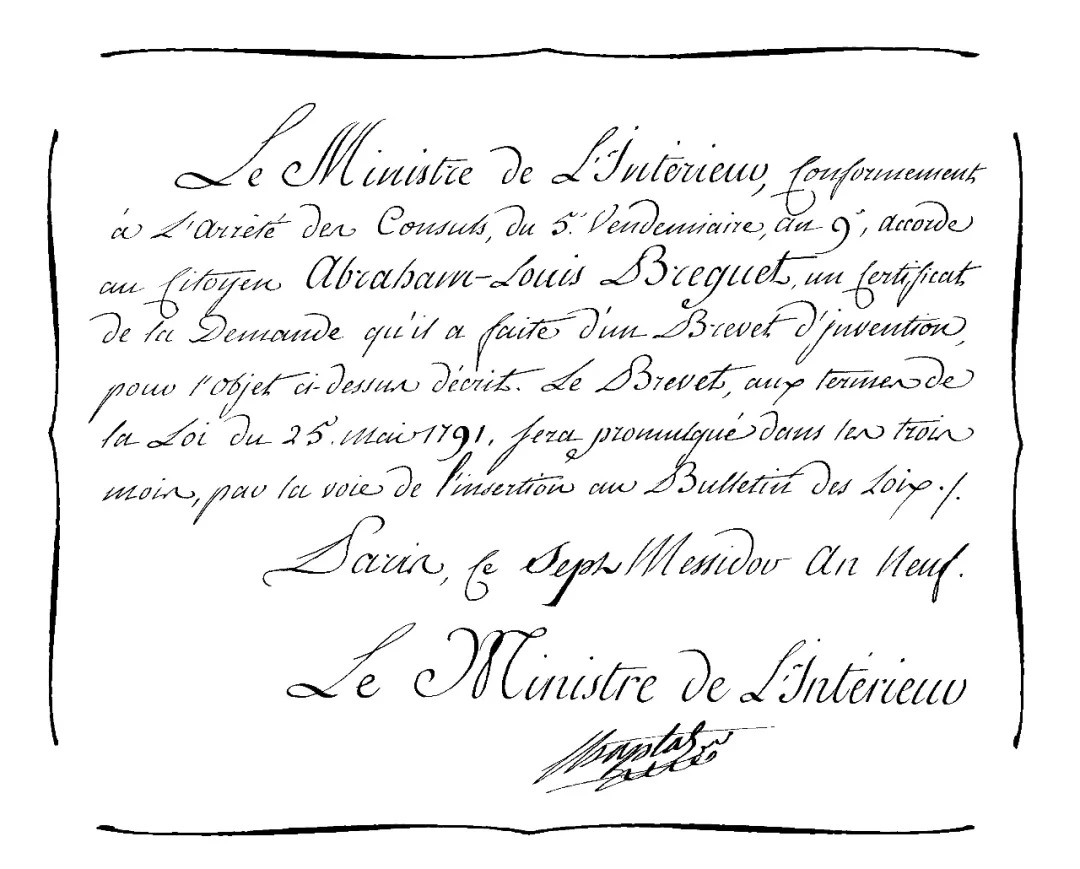 1801年6月26日,宝玑大师获得了一份为期十年的新式调教装置专利,即“陀飞轮”发明专利,这份文件保存于法国国家工业产权局,其中还有一封宝玑先生当时写给负责专利管理的内政部长的信。