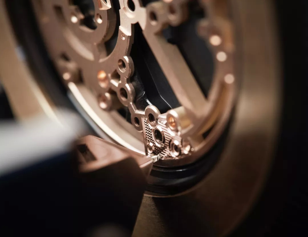 为实现这一超薄杰作,宝玑颠覆传统发条盒结构,自动上链通过在机芯边缘设置环形铂金摆陀实现,并以超轻钛金属制成陀飞轮框架,传动功能也直接设计在框架上,采用以半导体蚀刻工艺制成的高精密硅质游丝等等。