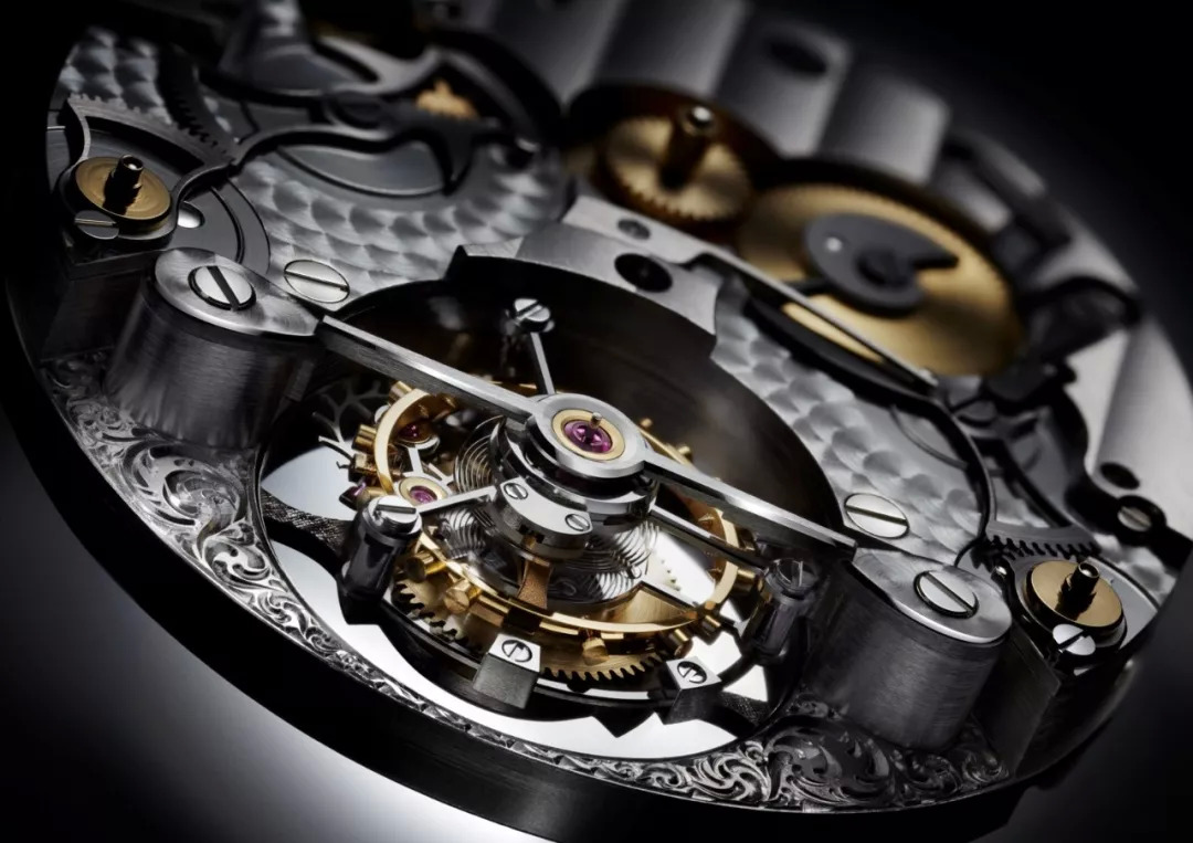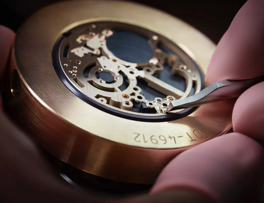 机芯夹板表面非镂空部分饰以手工镌刻的玑镂刻花图案;夹板和表桥锐利的边缘由工艺大师精心细致地手工倒角修饰,将棱角切削打磨至平整无瑕直至成45°角斜面;随后再进行重要的雕刻步骤,手工为不同的文字及镂空边缘雕刻纹饰。