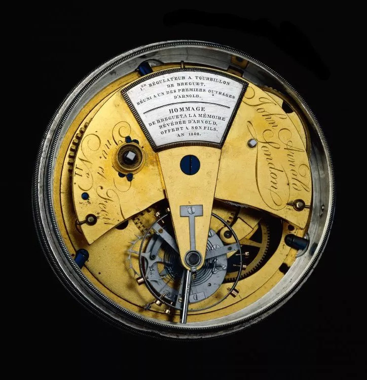 当年实验测试的陀飞轮,被宝玑大师更换到他的好友、英国制表师阿诺德赠给他的礼物上,并回送给阿诺德之子,也是他的学生。这枚怀表收藏在大英博物馆,表底上有阿诺德的签名以及宝玑陀飞轮铭牌。
