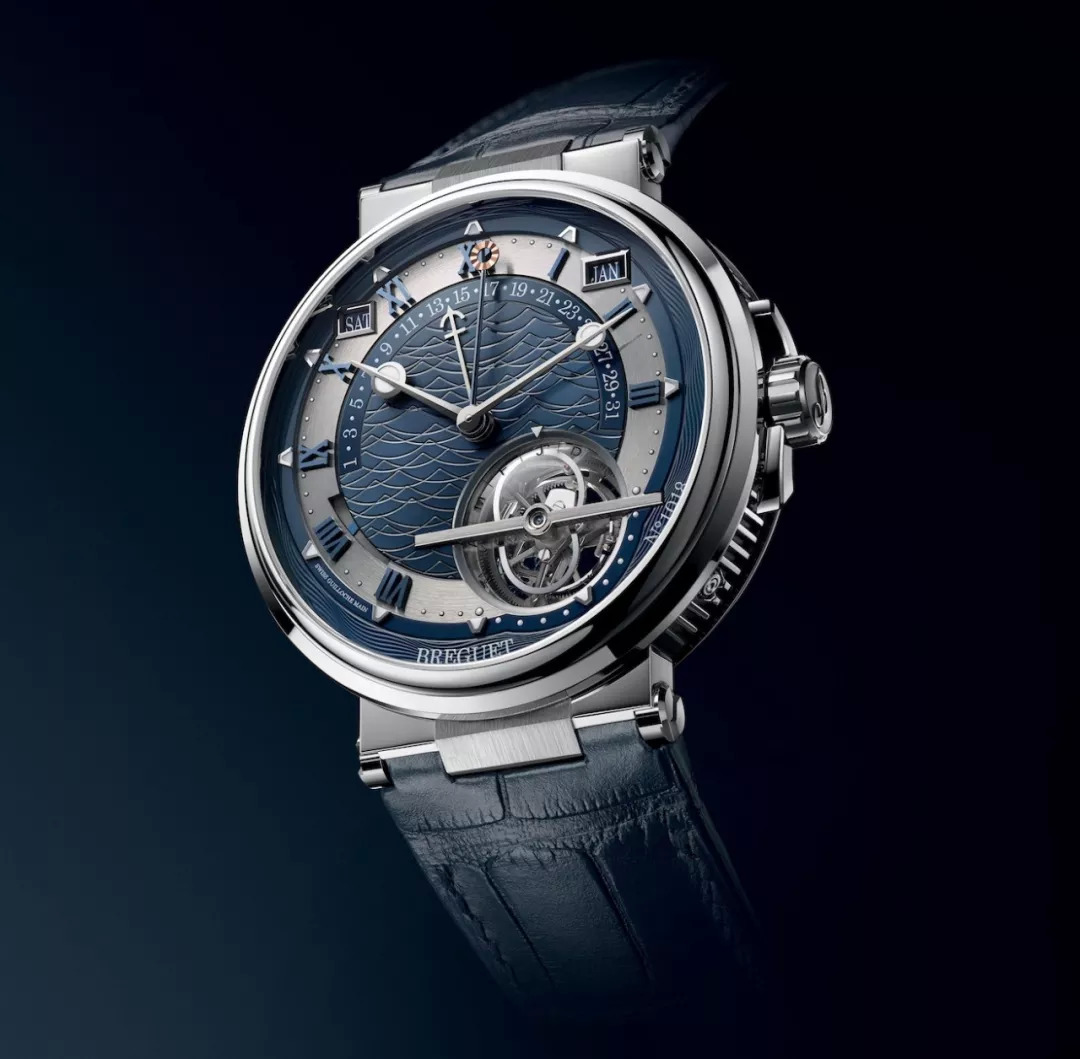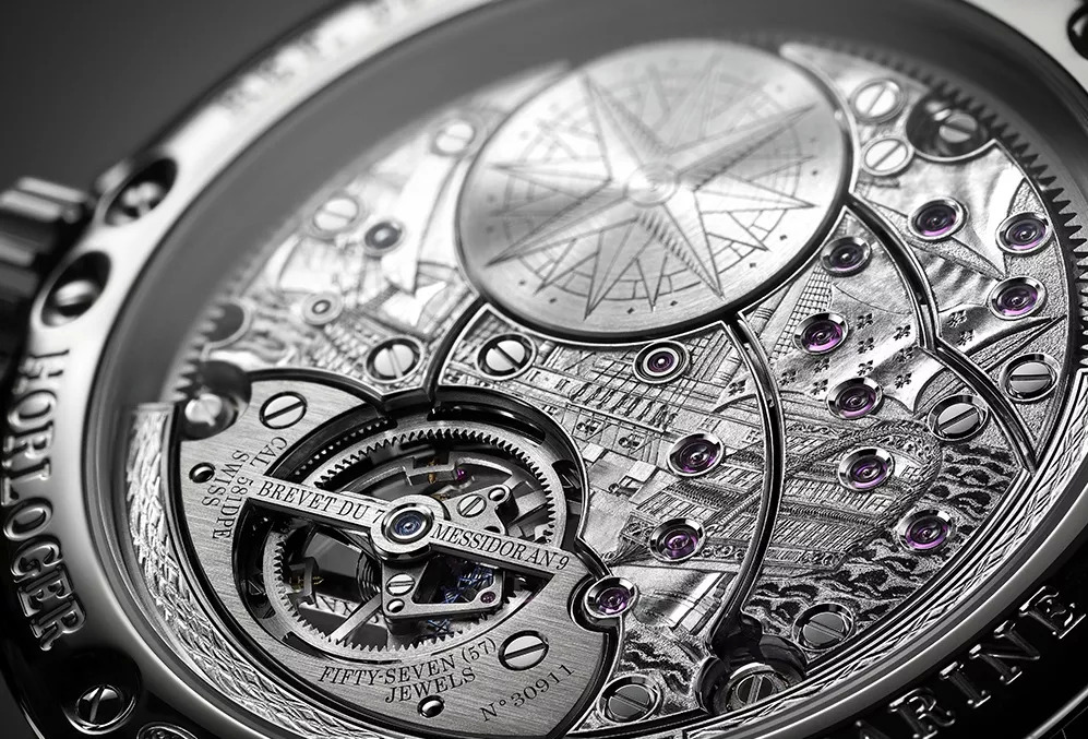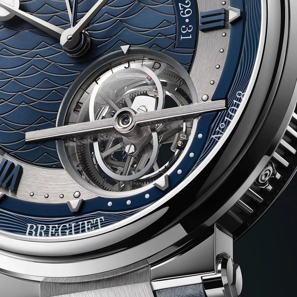 这款大复杂腕表上集合了诸多宝玑极致技术与顶级工艺美学,表盘上有两种不同的玑镂刻花图案,机芯夹板以手工雕刻装饰,发条盒饰有风玫瑰航海罗盘图案,表背极为华美。