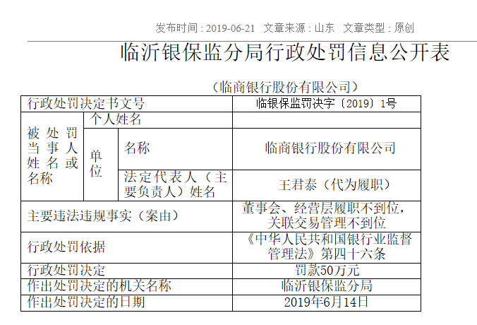 罚单信息显示,临商银行因董事会、经营层履职不到位,关联交易管理不到位等行为违反了《中华人民共和国银行业监督管理法》第四十六条规定,临沂银保监分局对该行罚款50万元。