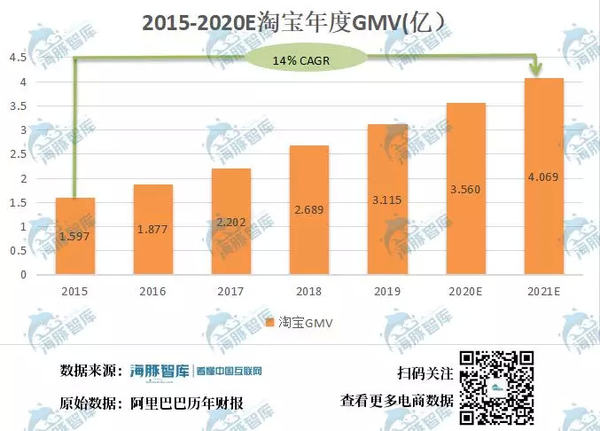 海豚智库分析,2015-2019年淘宝年度GMV年均复合增长率为14%,以此预估淘宝2021财年GMV将达到4.069亿。也就是说三年后淘宝直播的GMV将占到淘宝总量的12%,相比2018年的7%有所增长。