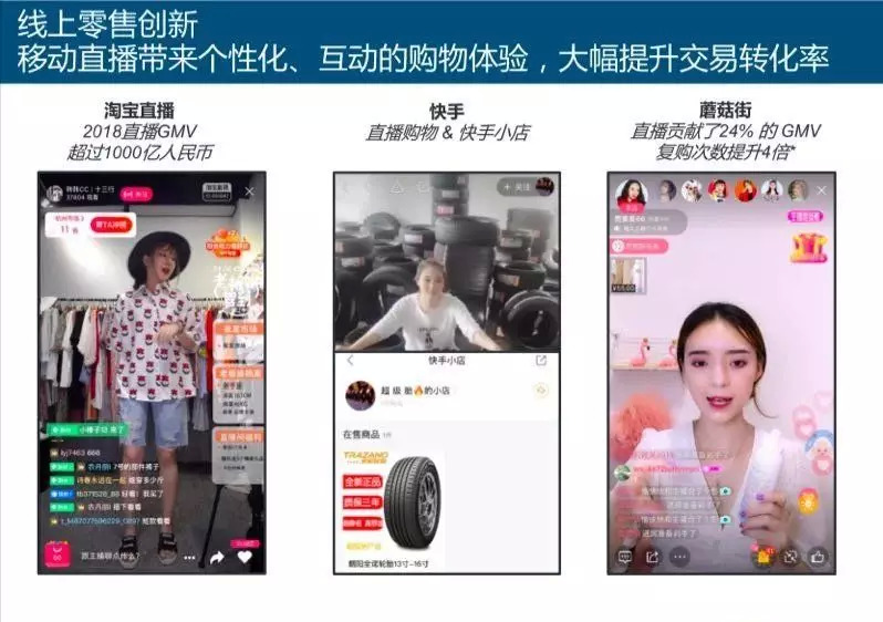 报告指出,2018年淘宝直播全年拉动GMV破1000亿,是抖音和快手的GMV总量,2018财年淘宝零售GMV为2.689万亿,占淘宝零售GMV的7%以上,淘宝直播月增速达350%。