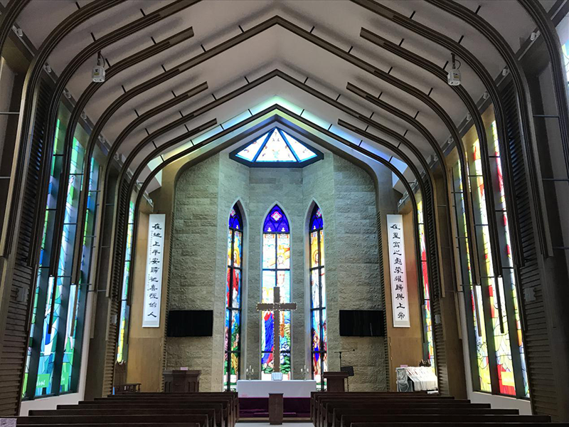 一德堂,一座哥特式建筑风格和现代建筑需求融合,采用大量传统彩绘图案。
