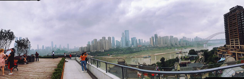 远处的朝天门码头上是正在修建的来福士广场,码头下的江域正是嘉陵江和长江的交汇之处。两江汇聚、大桥远架、高楼林立于对岸,只需要倚在看台上便能把整幅景色纳入眼底。