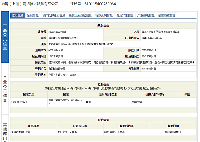 据界面新闻记者在全国企业信用信息公示系统网站上查询得知,Uber(优步)在国内的运营公司为御驾(上海)网络技术服务有限公司,为外国法人独资。法定代表人为Uber的全球运营总监Ryan Allan Graves,股东方为Uber International Holding B.V.。