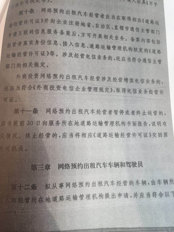 除了需要提供电子支付使用的支付结算协议以外,涉及电信业务的还要通过通信主管部门的有关规定。其中也特别指出,“外商投资网络预约出租汽车经营涉及经营增值电信业务的,应当符合《外商投资电信企业管理规定》,取得电信业务经营许可证。”
