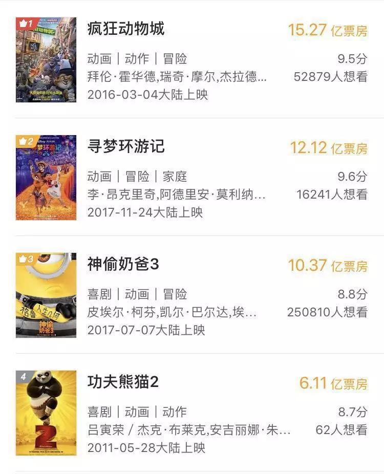 2010年以前,黄金时代的系列作品没能为皮克斯在国内打下江山,是一个遗憾,因为在这之后国内动画电影市场变得复杂了起来,时机已经错过。从2014年开始,国内电影市场上接连出现《神偷奶爸2》、《驯龙高手2》、《超能陆战队》、《功夫熊猫3》等,动画电影占比增加,迪士尼、环球影业、梦工厂等好莱坞制片厂纷纷发力国内动画市场,形成割据势力。2016年国内接连出现两部票房破10亿的好莱坞动画电影(《疯狂动物城》15.3亿、《功夫熊猫3》10.02亿)。