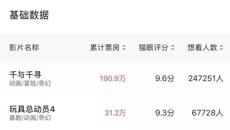 仅猫眼数据参考,《千与千寻》猫眼想看指数达到24.7万,《玩具总动员4》则为6.8万,差距明显。一个是经典电影国内首映,一个是经典系列回归,票房与人气差的差距到底是什么造就的,值得人思考。