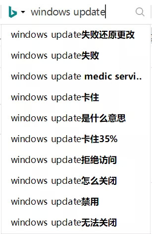 在微软自家的搜索引擎bing.com上输入Windowsupdate,关键词联想结果简直是大型劝退现场: