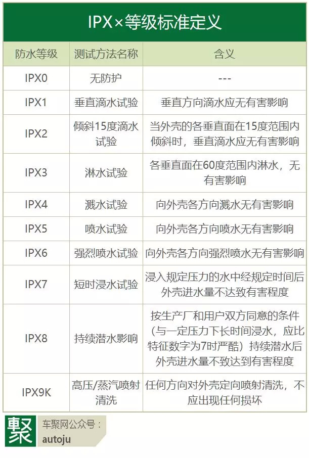 考虑到持续浸水影响,按车聚君的理解,纯电动汽车应该在IPX8等级及以上才行。