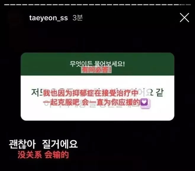 在金泰妍透露自己正在接受抑郁症治疗后,粉丝纷纷给她留言加油打气,但金泰妍的回复却让人心疼。
