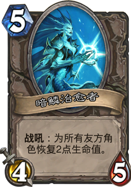 冰风雪人一度被认为是炉石中的最佳白板。4费提供4/5的身材非常稳固而超值。暗鳞治愈者基本上就是冰风雪人的多1费战吼版,用原来的那个经典被动效果卡牌为基础使它成为今日的这个样子。能够在任何时候挽救被像火妖这种怪蹂躏后脆弱的场面。对自己额外奶几点对于防快攻套也是很划算的,很可能苟住一回合就能教对面做人。牧师能真正将这张卡牌的效果发挥到极致,但任何职业就那么简单粗暴地用一下也是能从中获益的。