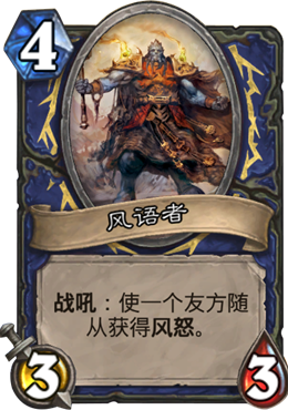 炉石中最容易被低估的卡牌效果之一是风怒。它能做到一些令人惊奇的事情,本质上可以让一个随从换掉两个对面的随从,多打脸一次,或者作为一个必须马上解掉的场面威胁。但除此之外,风怒效果并不常见,也很少在对战中占很大比重。风语者可以为萨满祭司改变这个局面,给萨满一个新的方式去变换他们的职业(打法)和战略。风语者有着4费3/3的合理身材,又能给你一个非常强力而且可控的正面效果。与火焰驱逐者或者火元素这样的卡牌结合使用,那画面太美我不敢看。