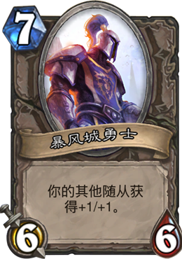 暴风城勇士在竞技模式套牌里是一张高选位的卡牌,但并没能令它因此进构筑。这真是荒谬,因为这张卡实际上很强,但尚未开发出来用法。6/6的身材恰好能避过王牌猎人的狙击,对于随从多的卡组来说又是一个极强的增益。它既可以用自己性价比稍低的身材来站场,又可以让buff过的随从更有效地与对面交换,或者让满场的随从再多造成一些伤害。像圣骑士或是萨满祭司这样的职业似乎非常普遍地能从这张牌的效果中受益,但其实只要组卡得当,任何卡组都是有这张牌的用武之地的。